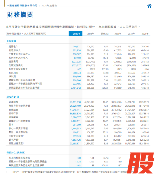 3月27日金融一线消息,建设银行公告,2025年实现经营收入7408.71亿元,增幅1.69%;净利息收入降幅逐季收窄,非利息收入占比提升3.65个百分点,手续费及佣金净收入增幅5.13%;盈利表现逐季向好,净利润3397.90亿元,增幅1.04%;归母净利润3389.06亿元,增幅0.99%;拨备前利润5139.82亿元、增幅1.70%。